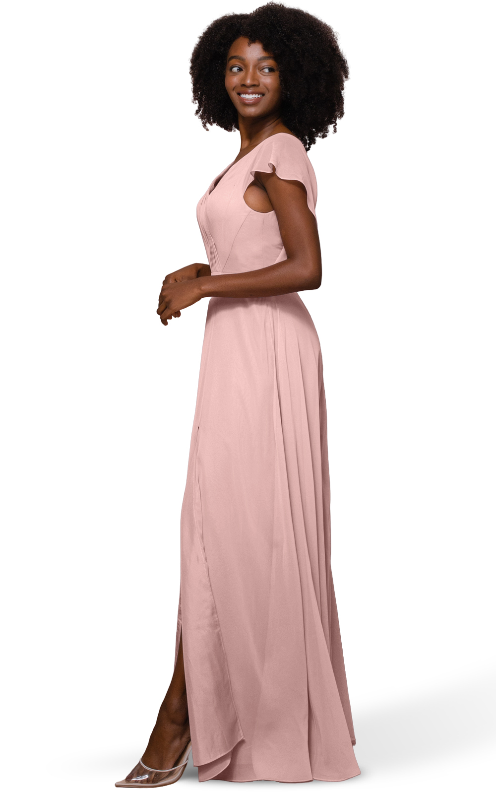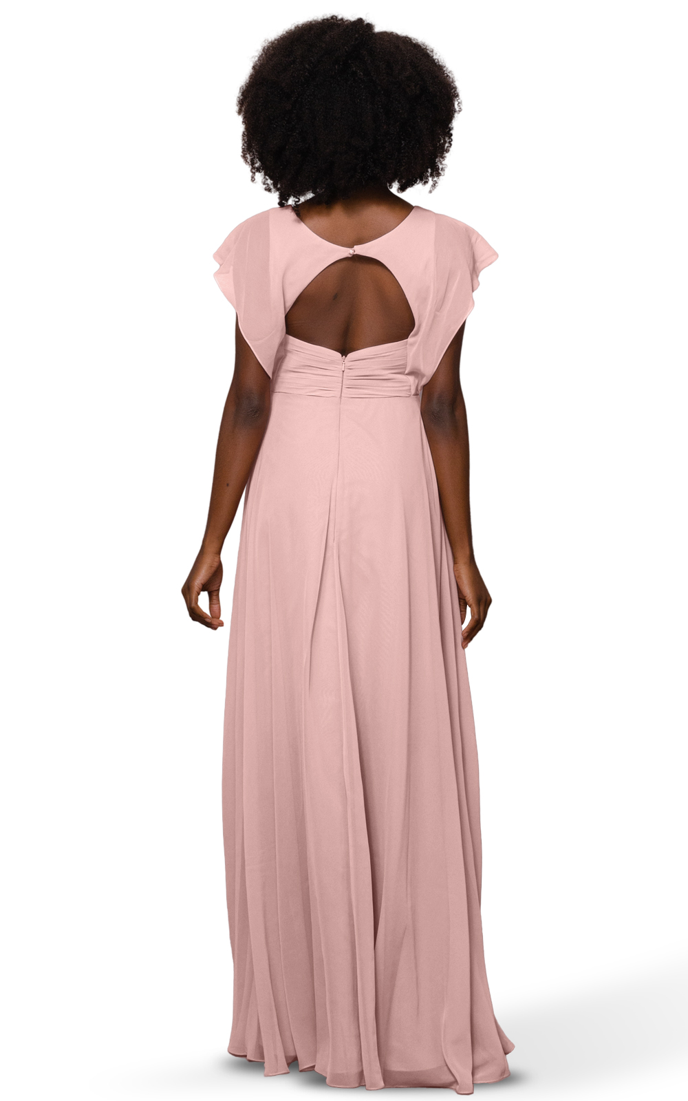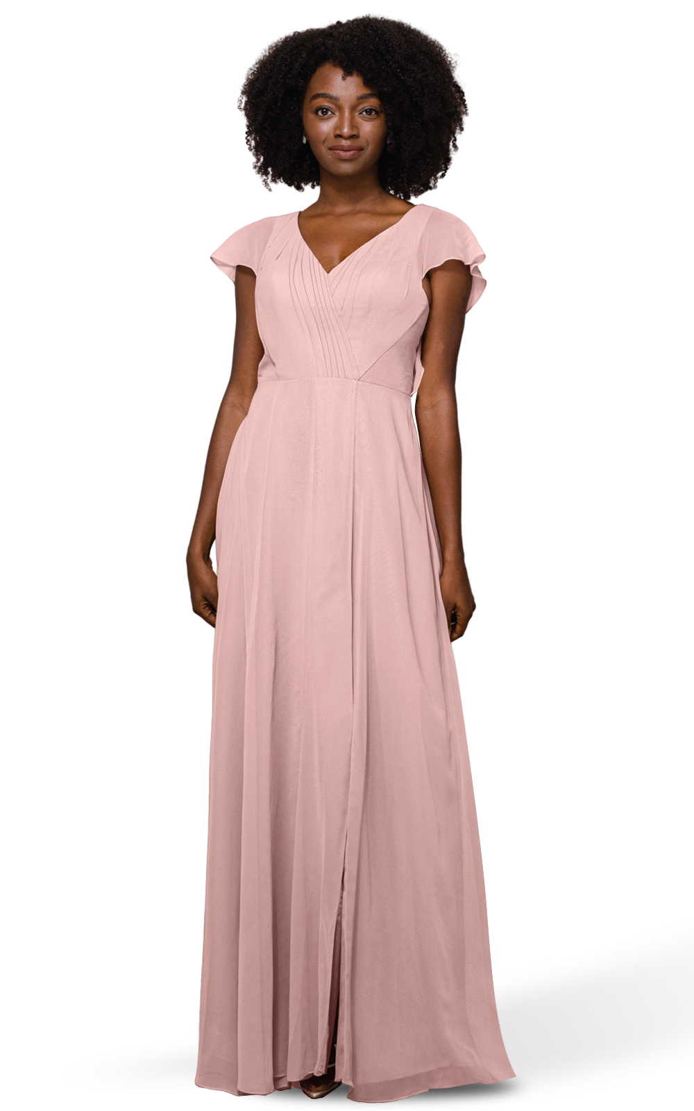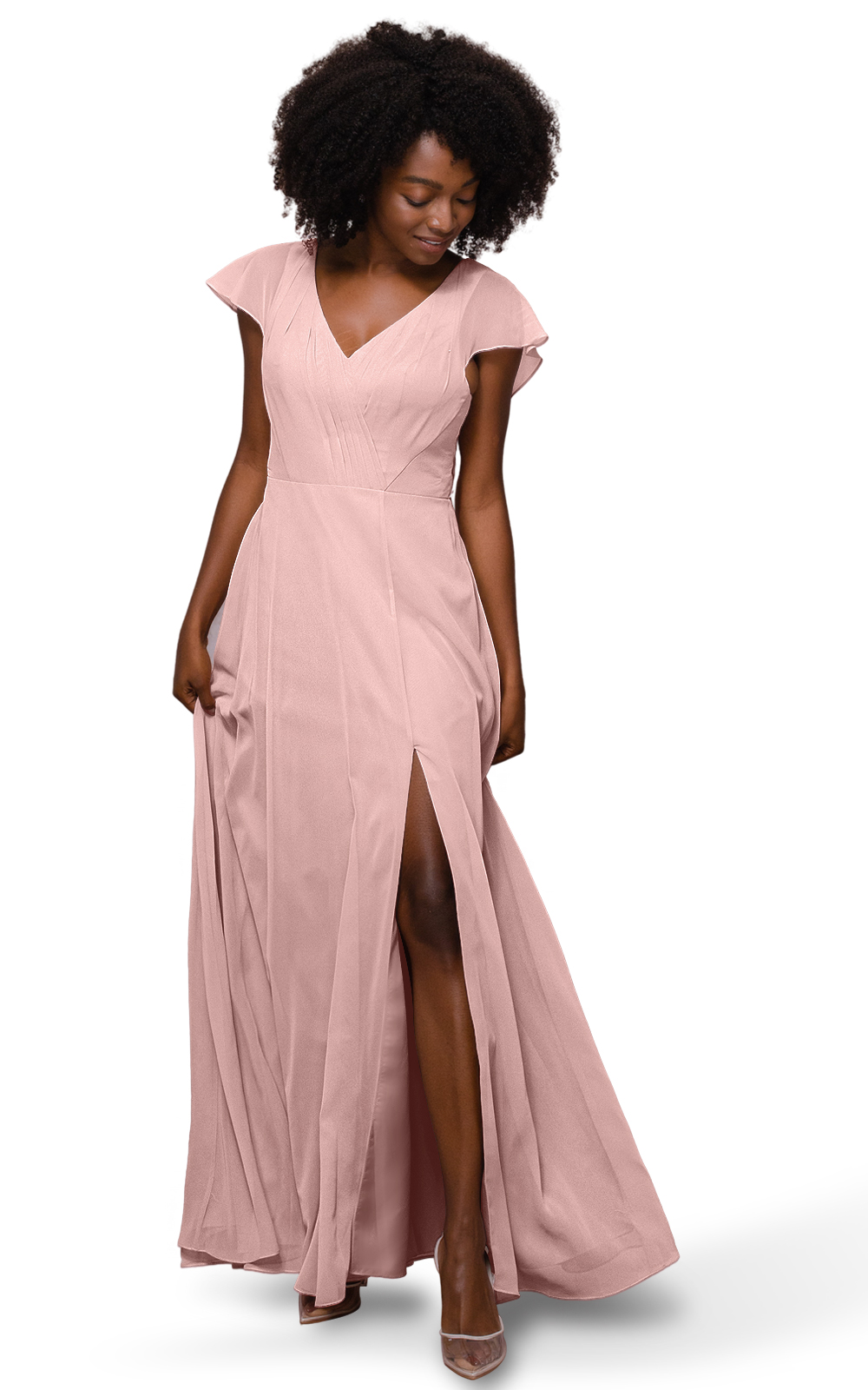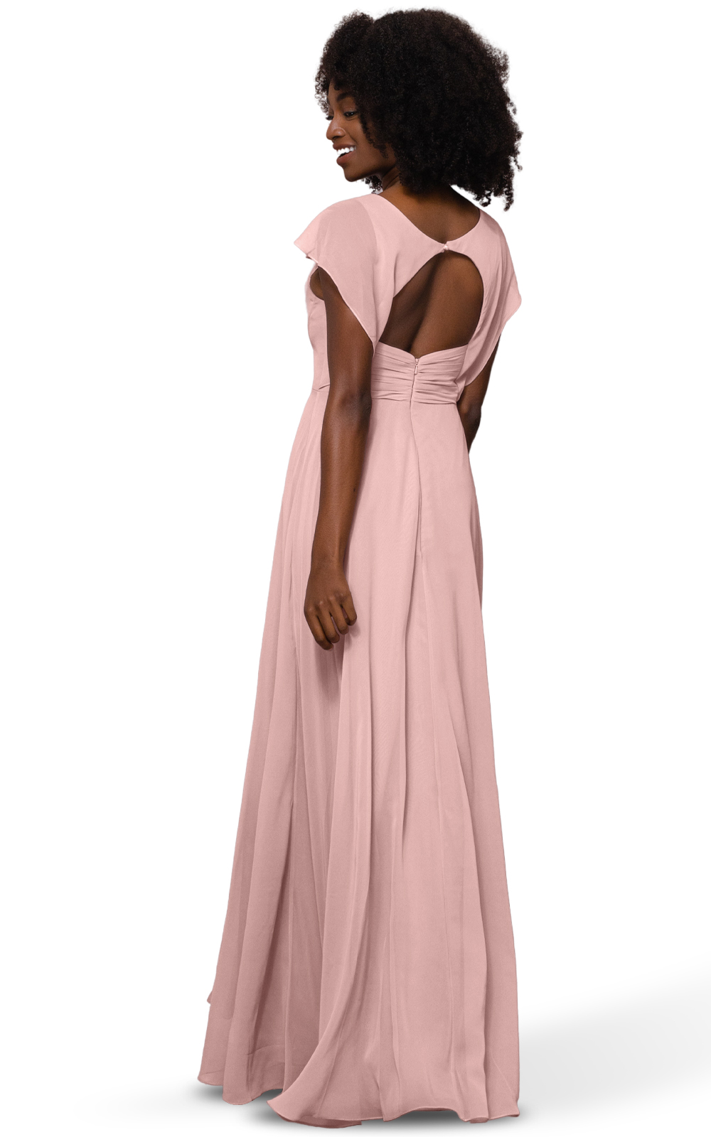 Embrace the simplistic sophistication of Gelsey Allure. This is a classic design with cap sleeves, v neckline, and keyhole back.