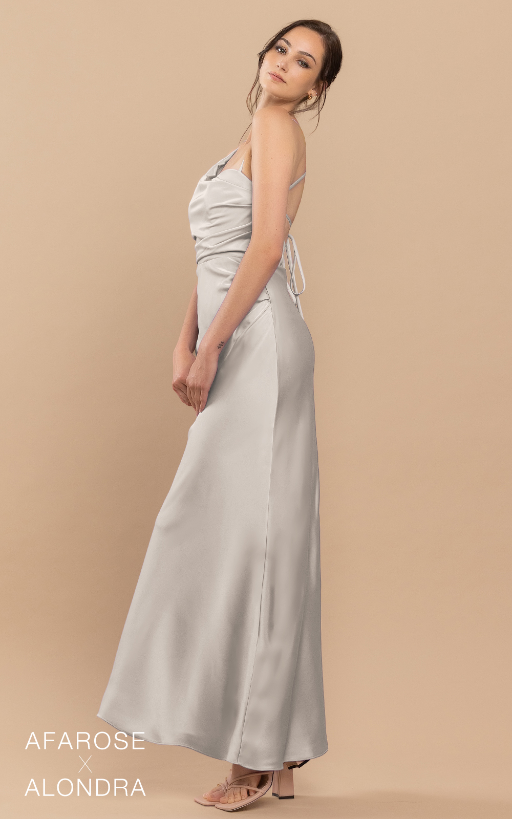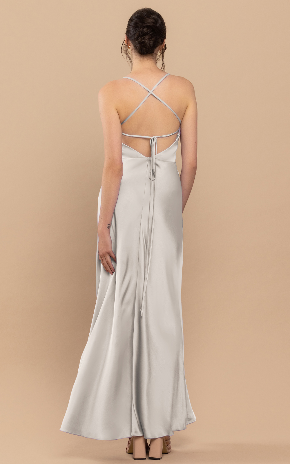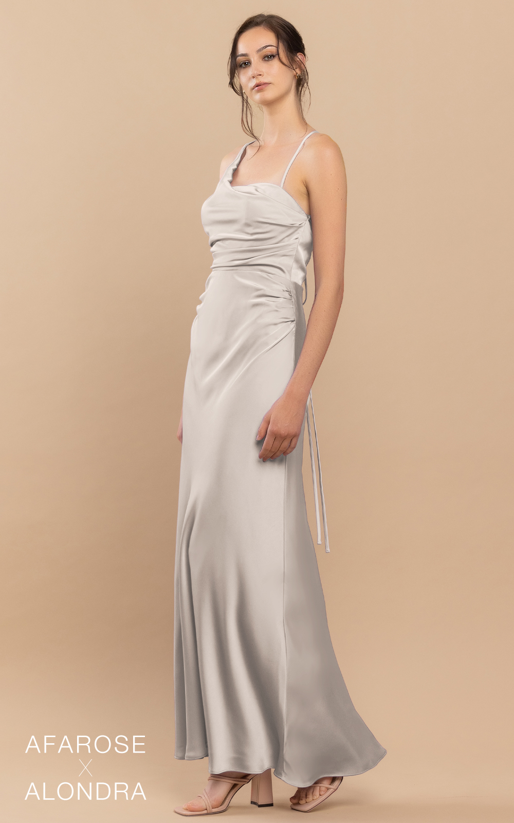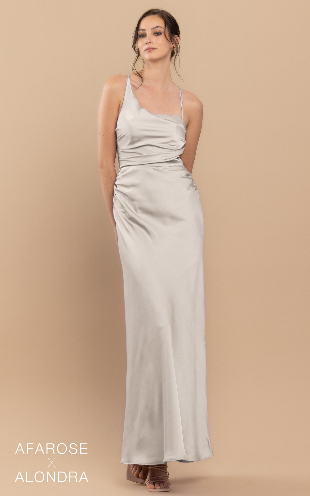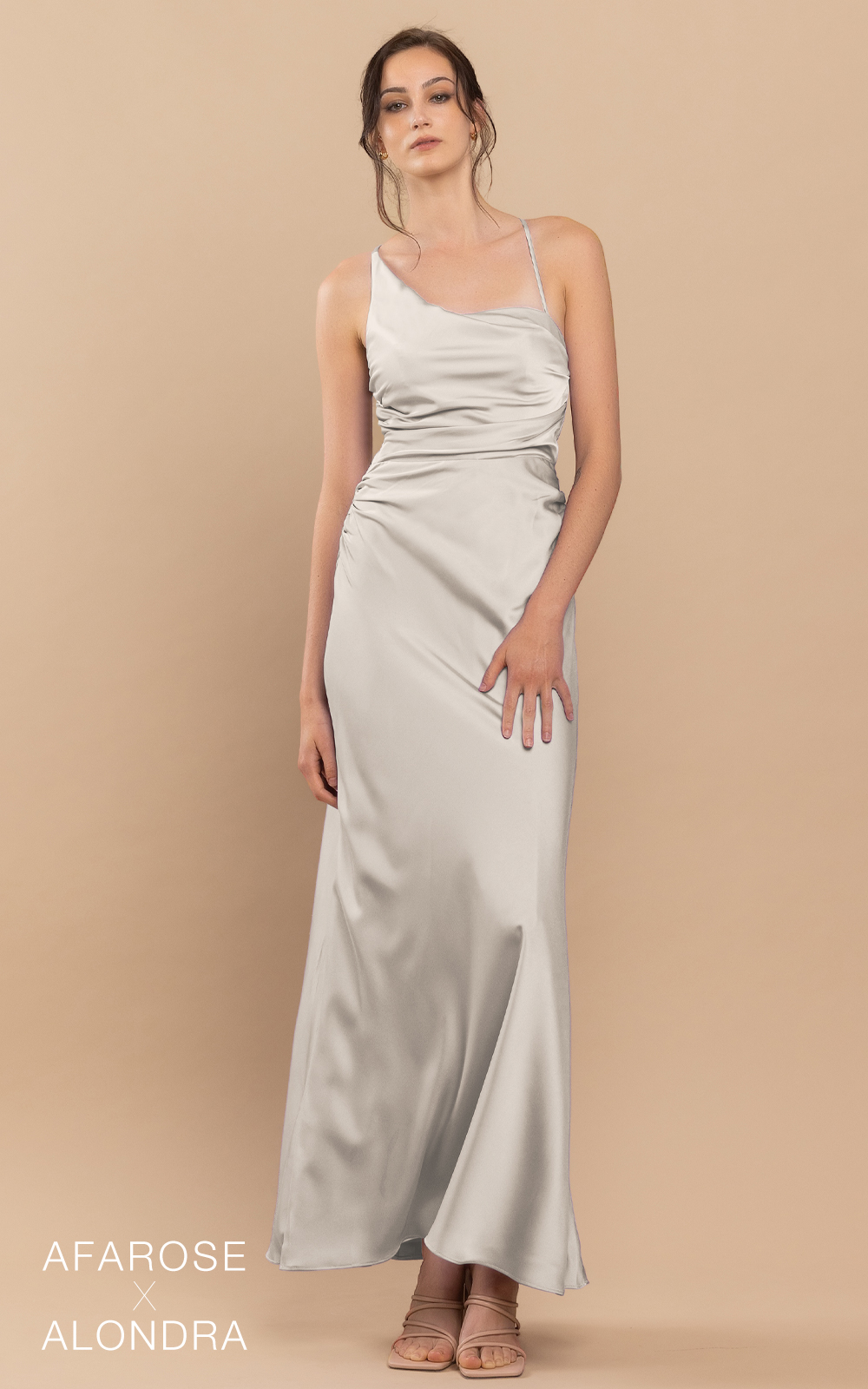 Classic style with a little twist in details. Dawn is a floor-length ruched satin dress. Its asymmetrical neckline makes it a unique and sophisticated piece of art. The waist is embellished with ruched details, adding texture and visual interest. Its sheath-column silhouette flatters your figure and accentuates your curves. With a cross-strap detail at the back, the dress ensures a secure and comfortable fit. The dress features padding for added comfort, and the absence of boning allows for easy movement. Perfect for formal occasions and special events, this dress will make you feel confident and stylish.